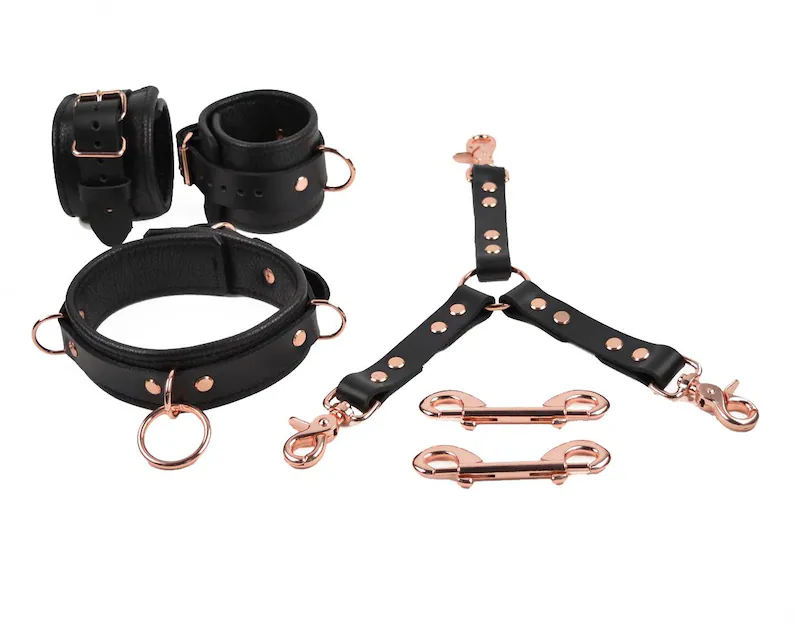 Looking for a versatile classic bondage set with a unique edge? This stunning black leather with rose gold restraint set is it! The quality feel of the rich black leather and eye catching detail of the rose gold hardware will surpass all your expectations.